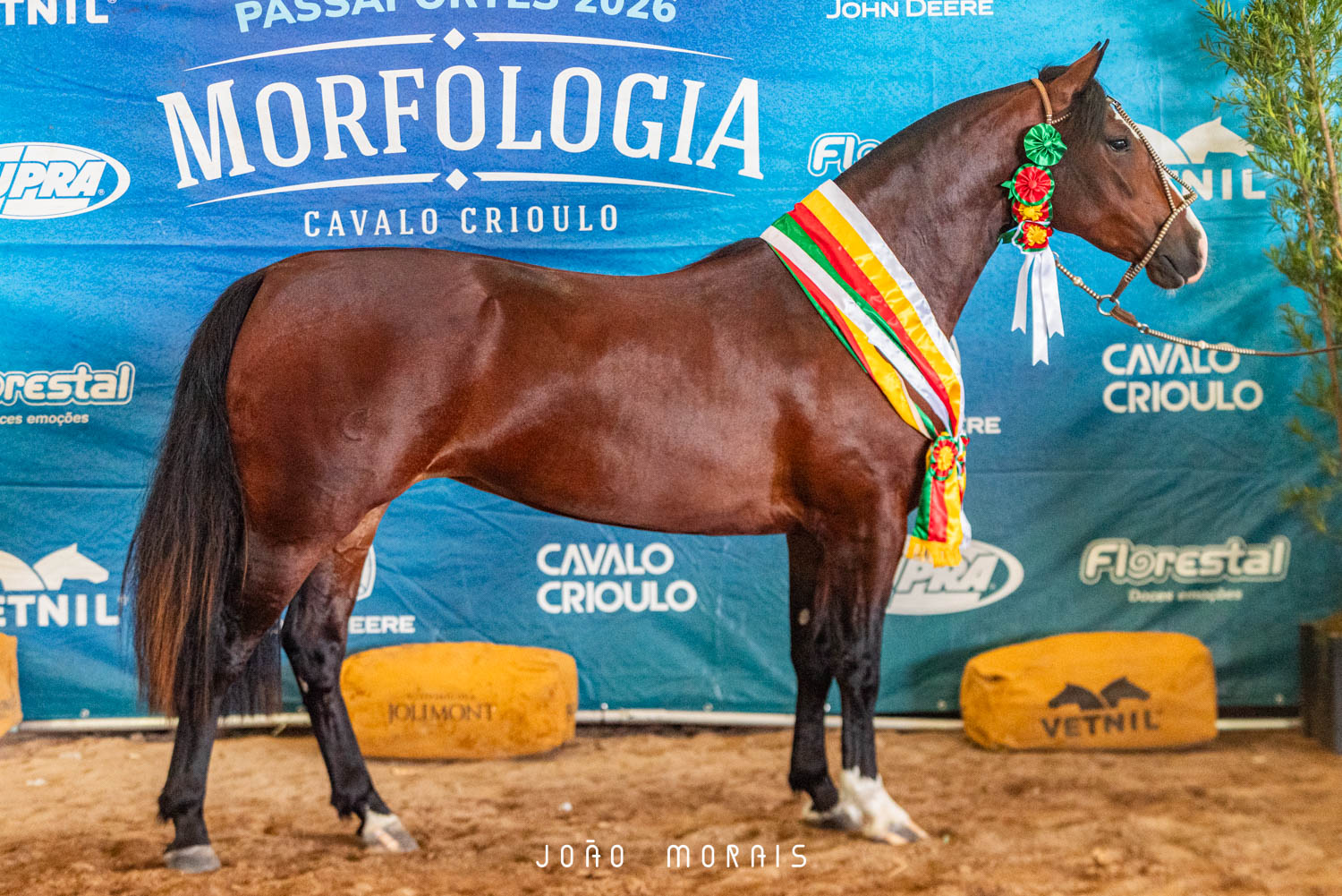 Completude, feminilidade e suavidade foram algumas das características que garantiram à potranca Basca Jade-TE (Box 82) o título de Melhor Exemplar da raça na etapa Morfológica em Caxias do Sul (RS). A fêmea colorada veio de longe, da Cabanha Basca de Uruguaiana (RS), e estreou em pista com vitória, seguindo o legado da mãe, Basca Constância, vencedora da Morfologia do Cavalo Crioulo em 2020 na Expointer. Na última Exposição Passaporte de Primavera do ciclo 2026 do Cavalo Crioulo, foi a Campeã entre as Fêmeas e a vencedora da categoria Potranca Menor, garantindo a sua vaga para a pista maior em Esteio (RS). “Se apresentou muito bem encilhada no campeonato. É raro ver uma potranca com os andares, a comodidade, o avanço e a seriedade dela em pista. Completa, feminina, suave e de boa palheta. É a fêmea mais correta em seus aprumos”, destacou o jurado da seletiva, Mário Santos Suñe, que teve como auxiliar Marcelo Campos.