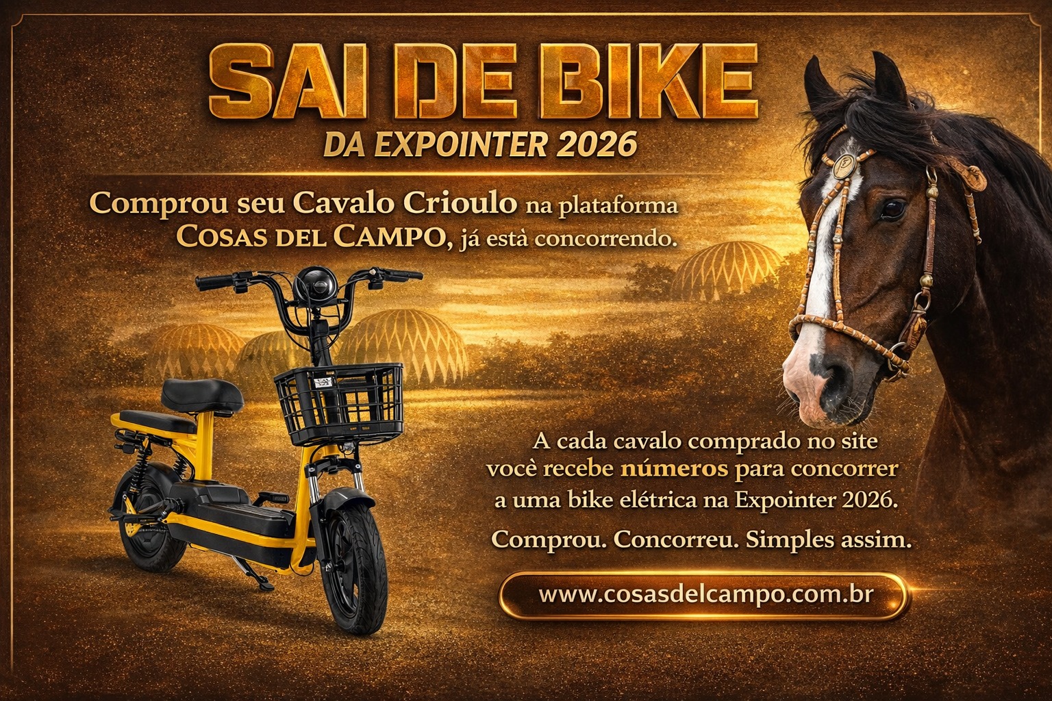 A chance de realizar o sonho de ter um Cavalo Crioulo e ganhar uma BIKE elétrica! Já pensou em conquistar um animal de alto padrão e, ainda por cima, concorrer a prêmios incríveis? Na Cosas del Campo, sua oportunidade está mais perto do que você imagina!